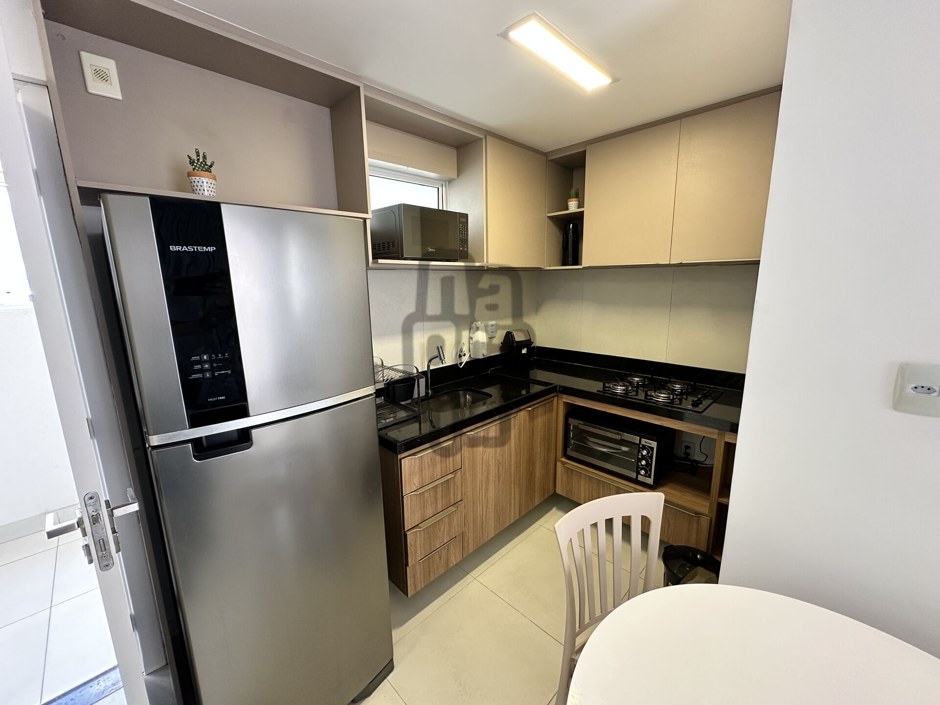 Além disso, a sala de estar e jantar integradas, criam um ambiente amplo e acolhedor perfeito para relaxar ou receber visitas, cozinha americana totalmente equipada com geladeira, fogão, micro-ondas e armários planejados, oferecendo praticidade para o dia a dia, além da varanda com vista parcial para o mar, o espaço ideal para momentos tranquilos, apreciando a brisa do mar.
